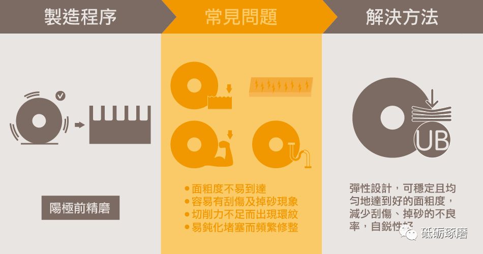 ●UB砂輪的磨料被包覆在獨家的纖維中,減少直接碰觸工件的力量