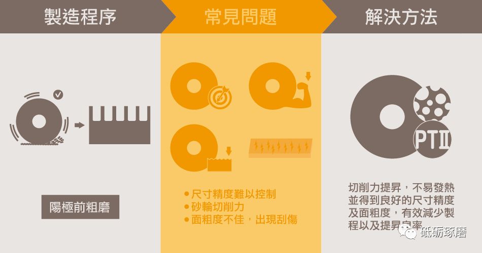 1.切削能力:優異,厚薄管工件很難控制尺寸(薄處切削能力下降),使用PTⅡ砂輪,切削能力很強,可以改善此一問題。