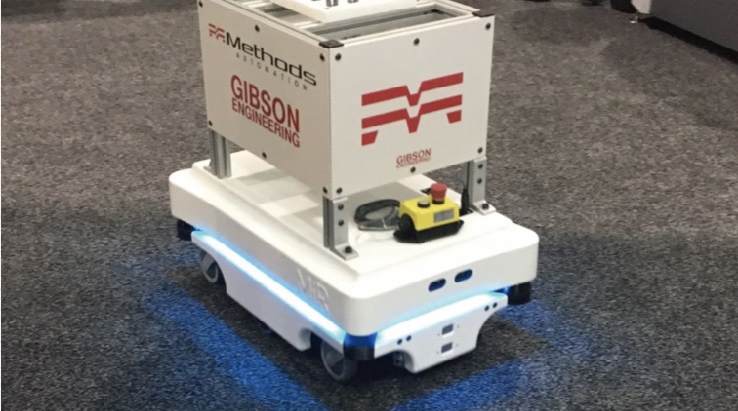 一個機器人從一台機器上卸下零件,將它們放置在自行引導的車輛上,然後傳送到另一台收集零件進行檢查的機器人。車輛繞過各種障礙物,表明自動系統互連不再需要固定的軌道。