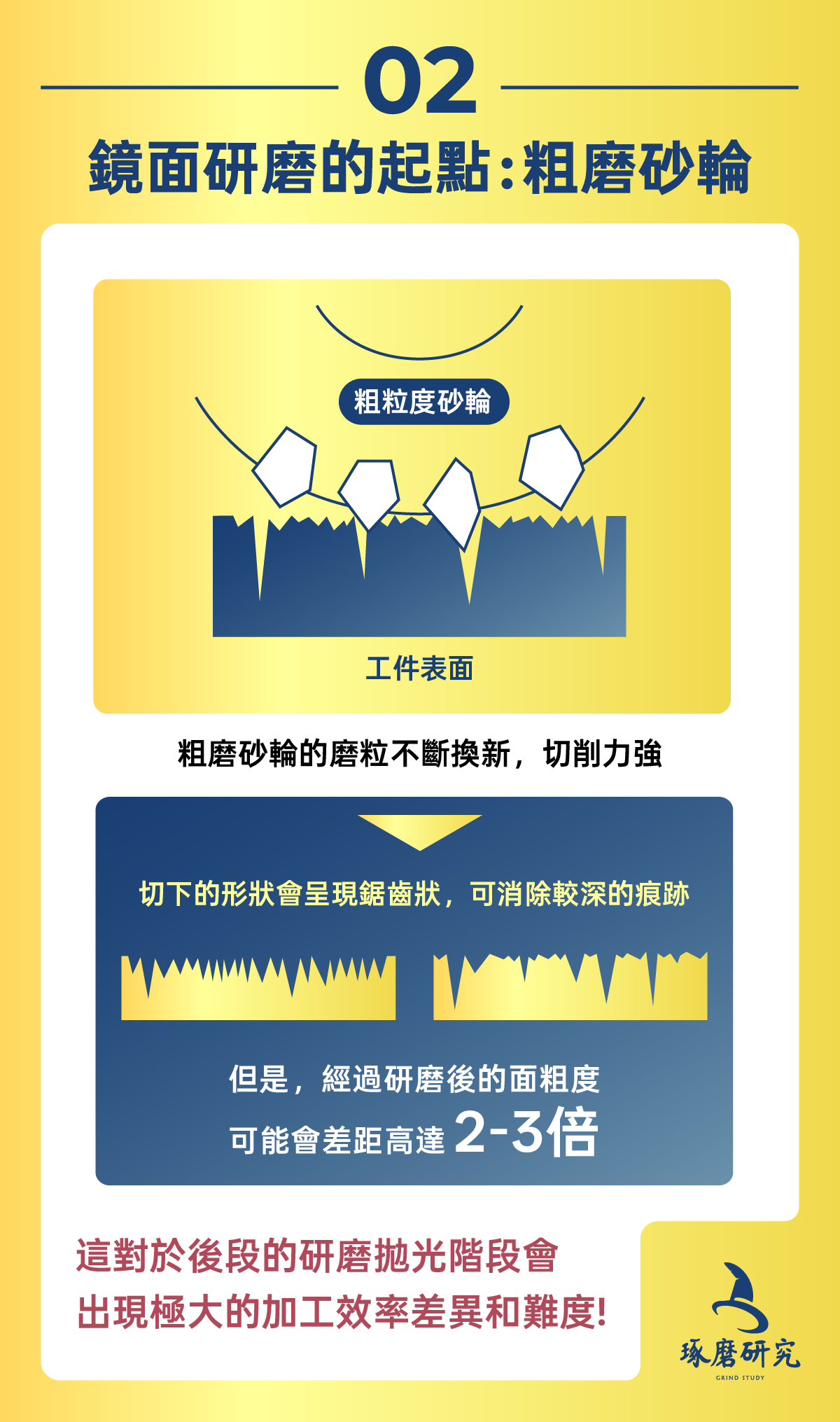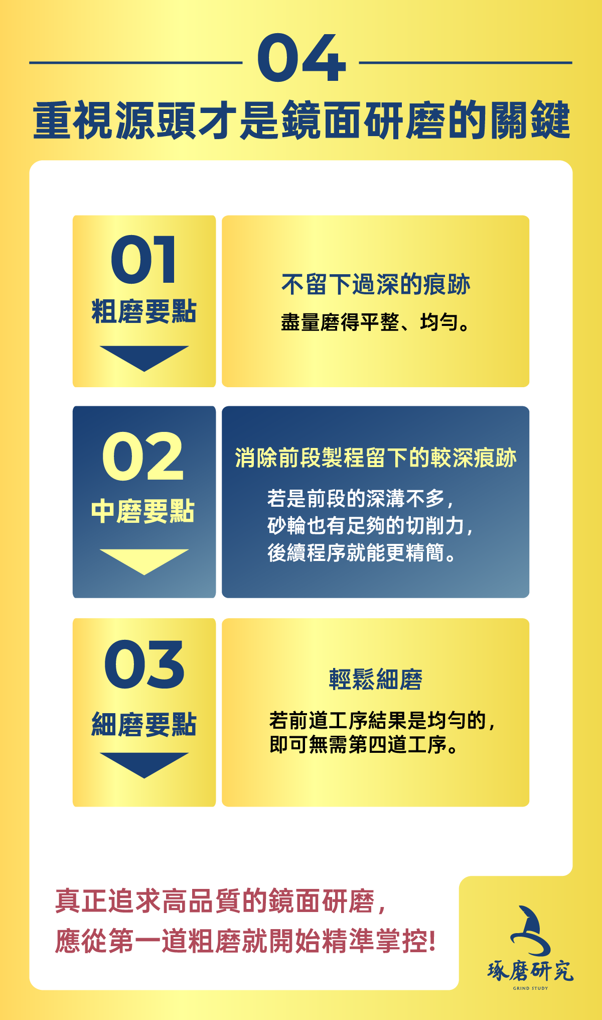 真正追求高品質的鏡面研磨,應從第一道粗磨就開始精準掌控,而不是僅依賴後段細粒度砂輪來彌補。