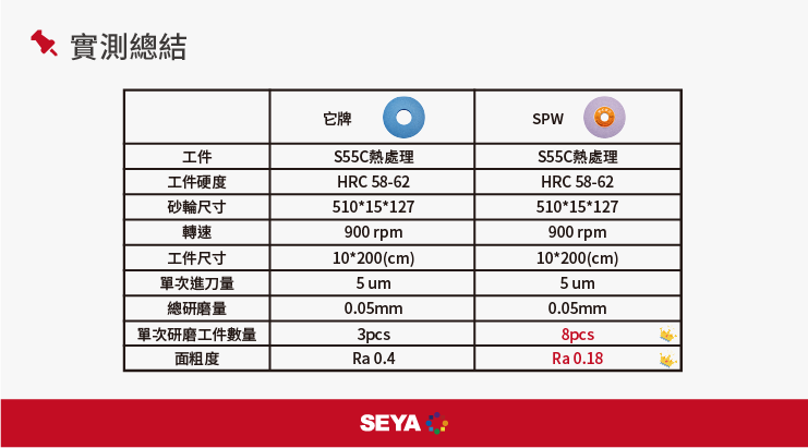 從圖表可以看到,S55C的硬度已經超過HRC50,算是高硬度材料,在加工參數不變的情況下,因為SPW璀璨砂輪的形狀保持力好,單次研磨的工件總數上升3倍,壽命更長,修整次數降低很多,面粗度也下降50%,由此可知SPW非常適合用在成型研磨,成效高,測試非常成功。