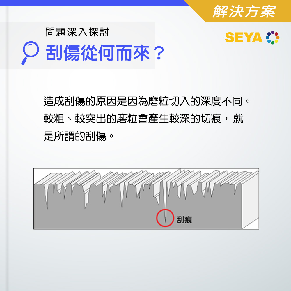 刮傷從何而來? 造成刮傷的原因是因為磨粒切入的深度不同。而造成磨粒切入的深度不同的原因,有以下幾種可能:
